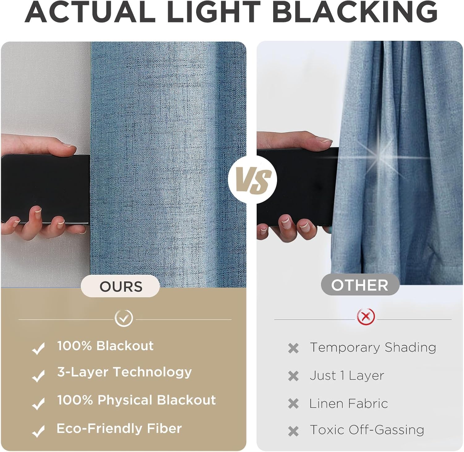 - 100% Blackout & UV Defense: Engineered with dual-layer construction (featuring a gray backing liner), these blackout curtains deliver 100% sunlight elimination and harmful UV blockage. Darker curtain hues enhance performance, keeping rooms cooler in summer and warmer in winter—ideal for nurseries, home theaters, and light-sensitive sleepers.