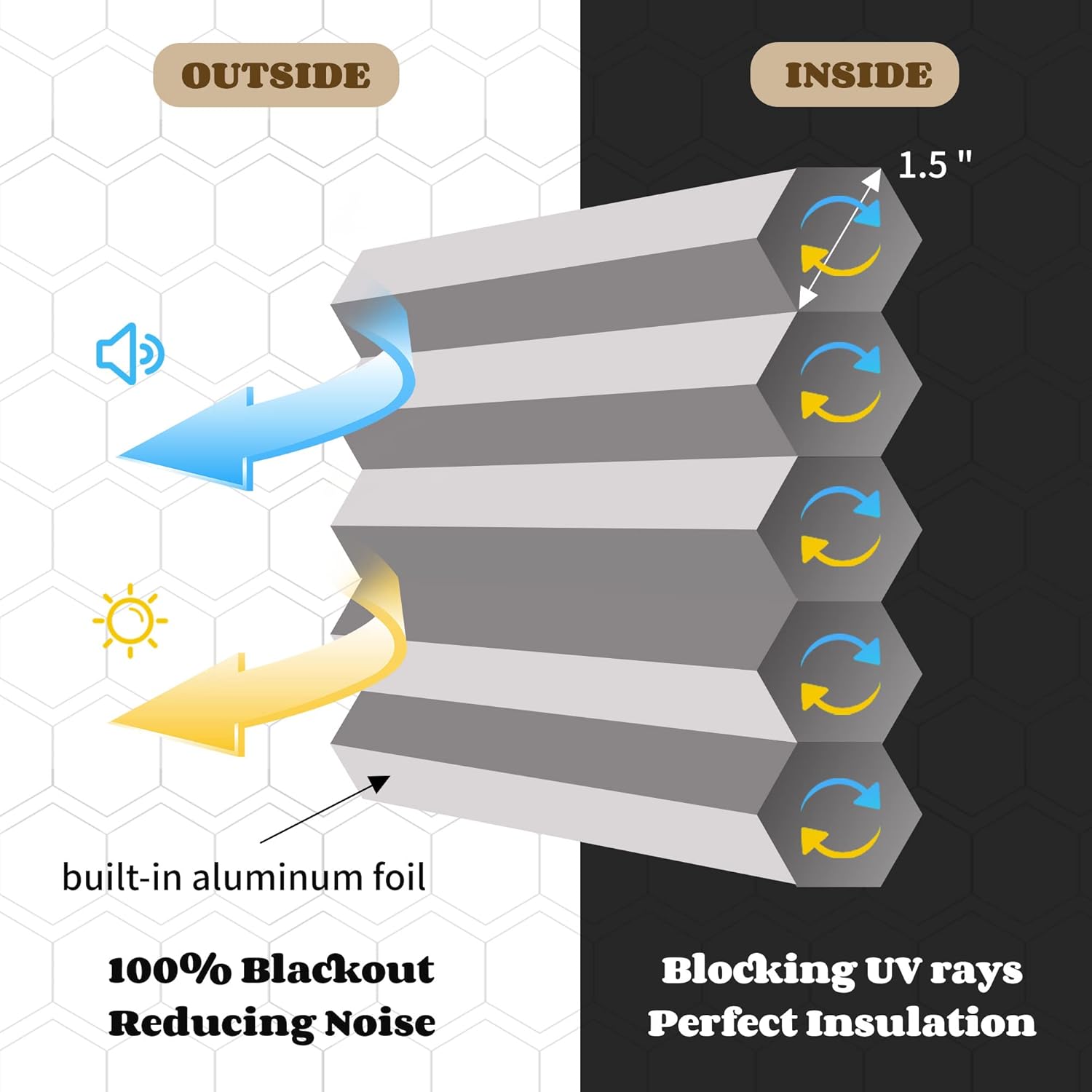 - 100% light blocking: Special blackout lining attached inside honeycomb material blocks 100% light and harmful UV rays, ensuring complete privacy and darkness
