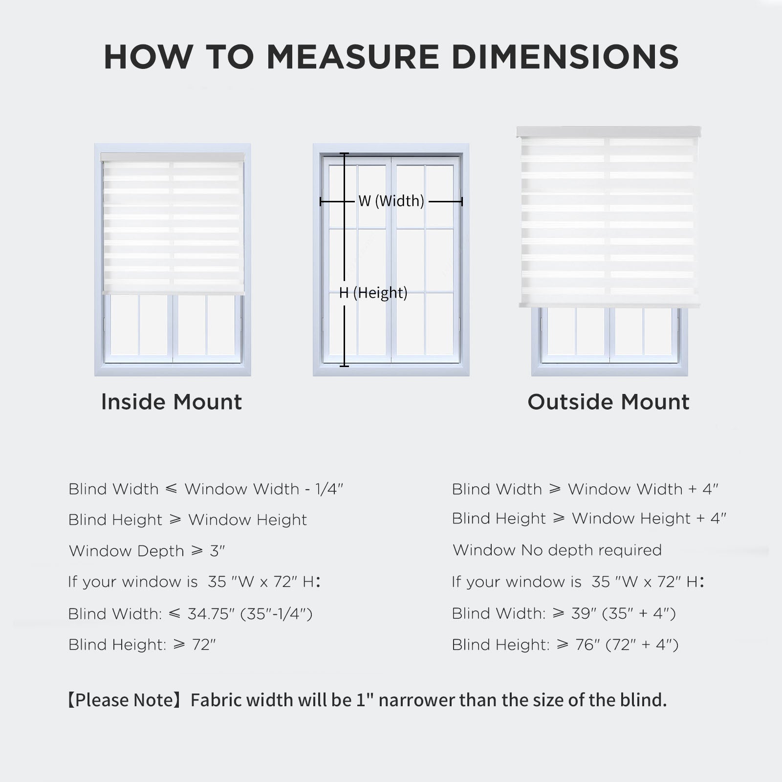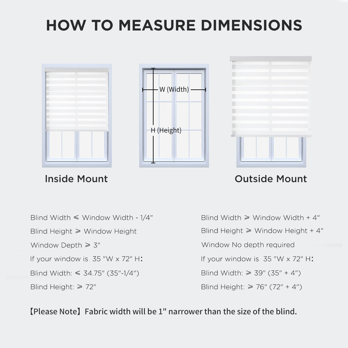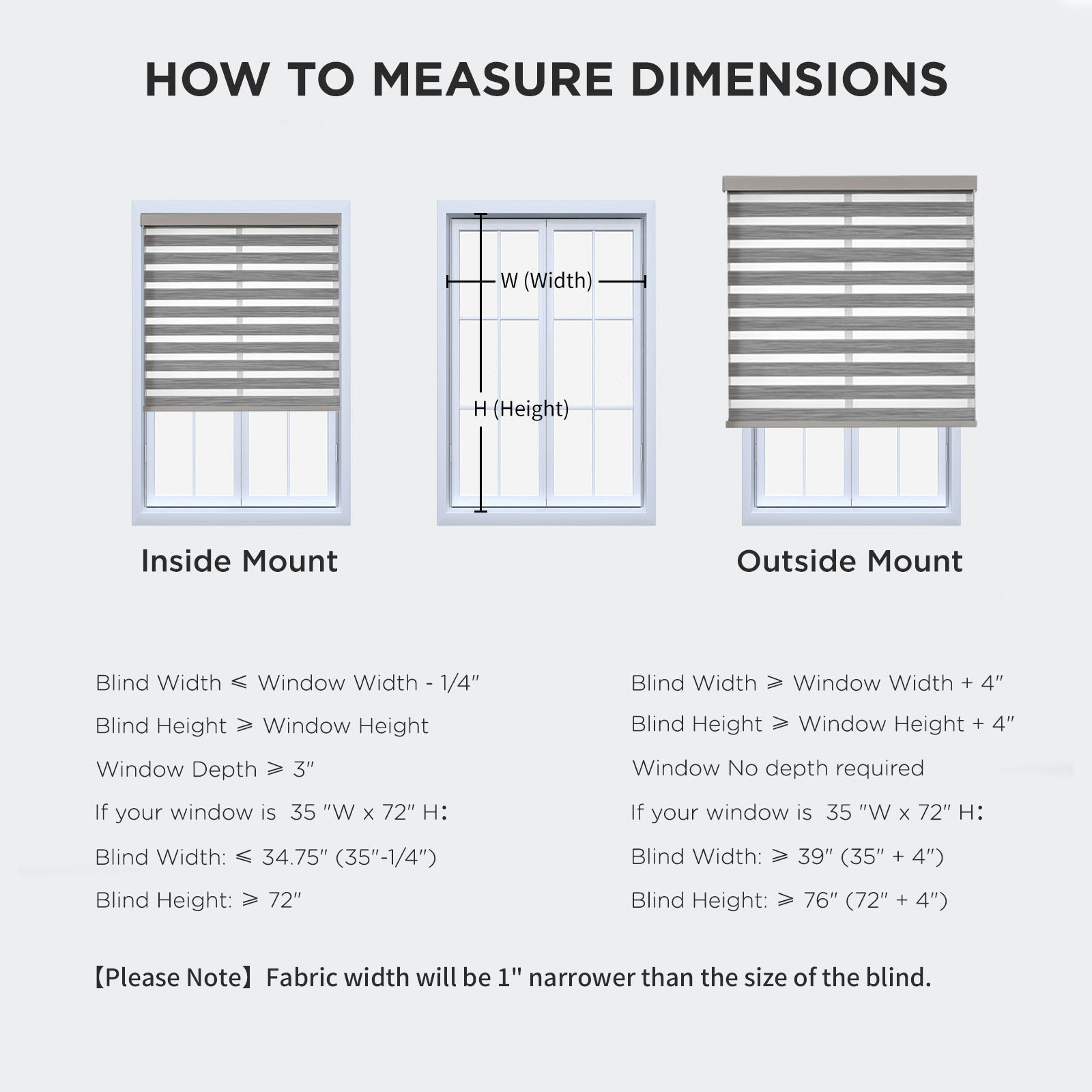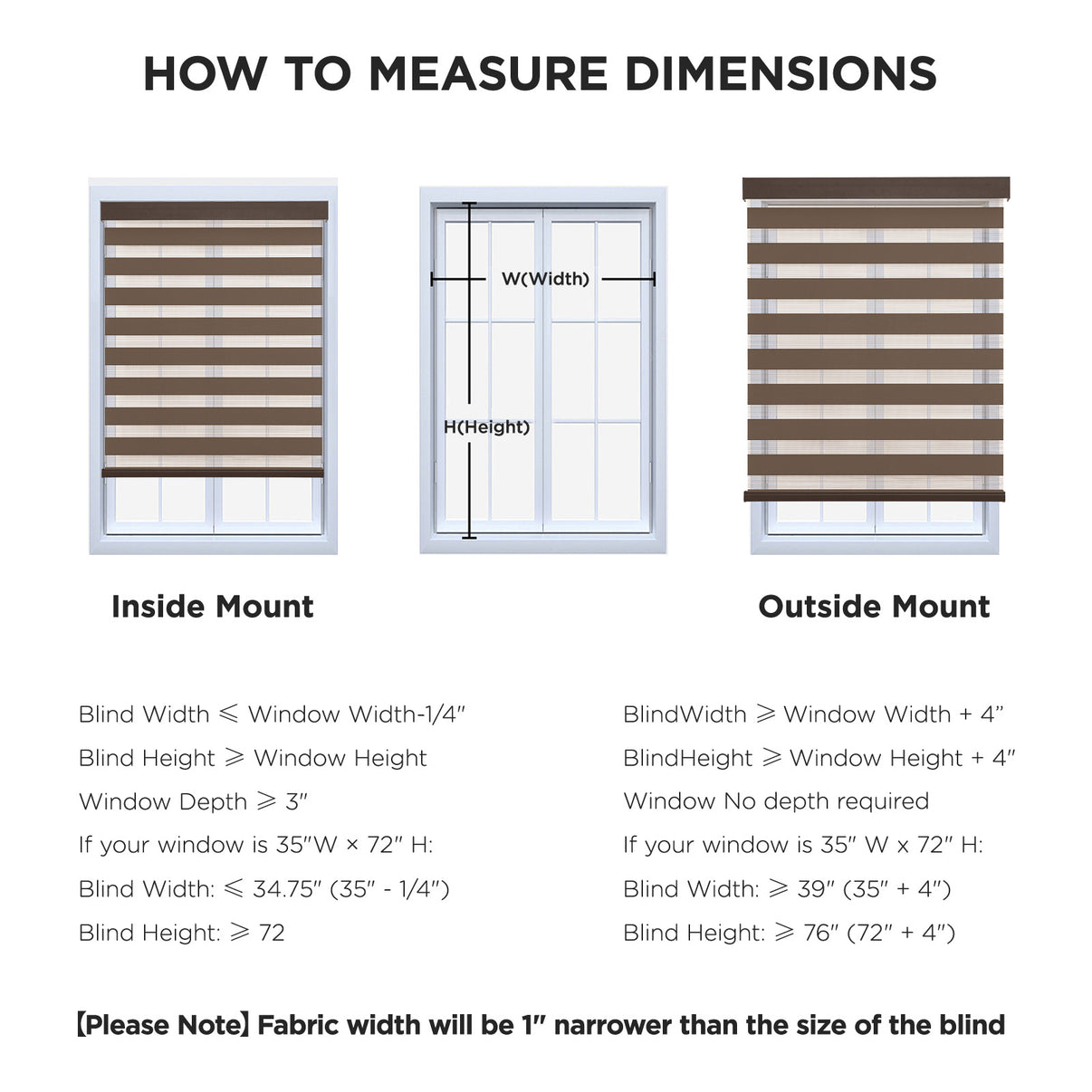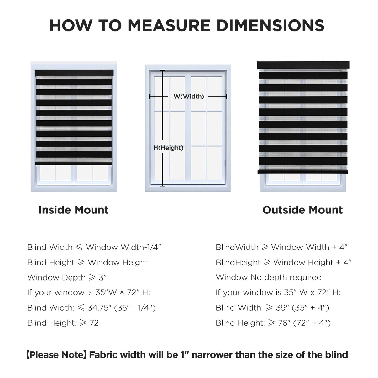 - 【How to choose a correct size】Example your window meas 35"W x 72"H:①INSIDE MOUNT: Window Width deduct 0.25" is Blind width. Blind Width≤35"-0.25=34.75"; Blind Height≥72". ②OUTSIDE MOUNT: Plus at least 4" is blind width, Blind Width≥35"+4"=39"; Blind Height≥72+4=76".【Pls Note】Fabric width will be 1" narrower than the size of the blind.