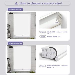 - 【 Medidas 】: Para el montaje interior, el marco de la ventana debe tener al menos 7,6 cm de profundidad, y las persianas enrollables opacas deben tener un pequeño espacio de luz a cada lado. 【IMPORTANTE】: El tamaño de nuestra tela es 2,5 cm menor que el tamaño seleccionado. Para evitar el espacio de luz, considere el montaje exterior. Para el montaje exterior, la persiana debe ser de 10 a 15 cm más ancha que el marco de la ventana, y su largo debe ser al menos 5 cm mayor que el largo de la ventana para una mejor cobertura.