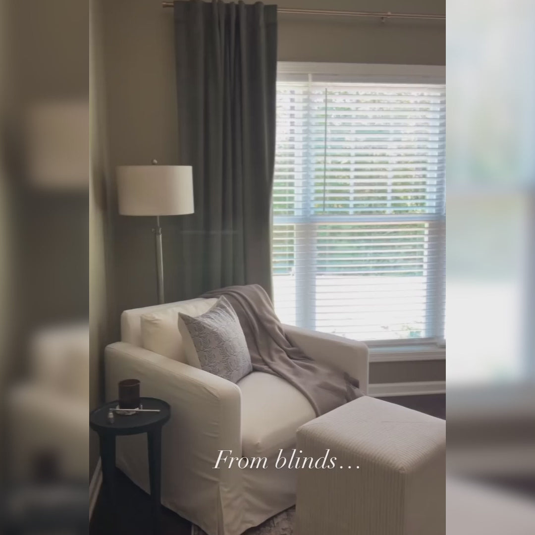 Las cortinas de montaje exterior se instalan fuera del marco de la ventana. Son una opción popular cuando las cortinas son la única cobertura. Extenderlas más allá de la ventana proporciona el máximo control de la luz.