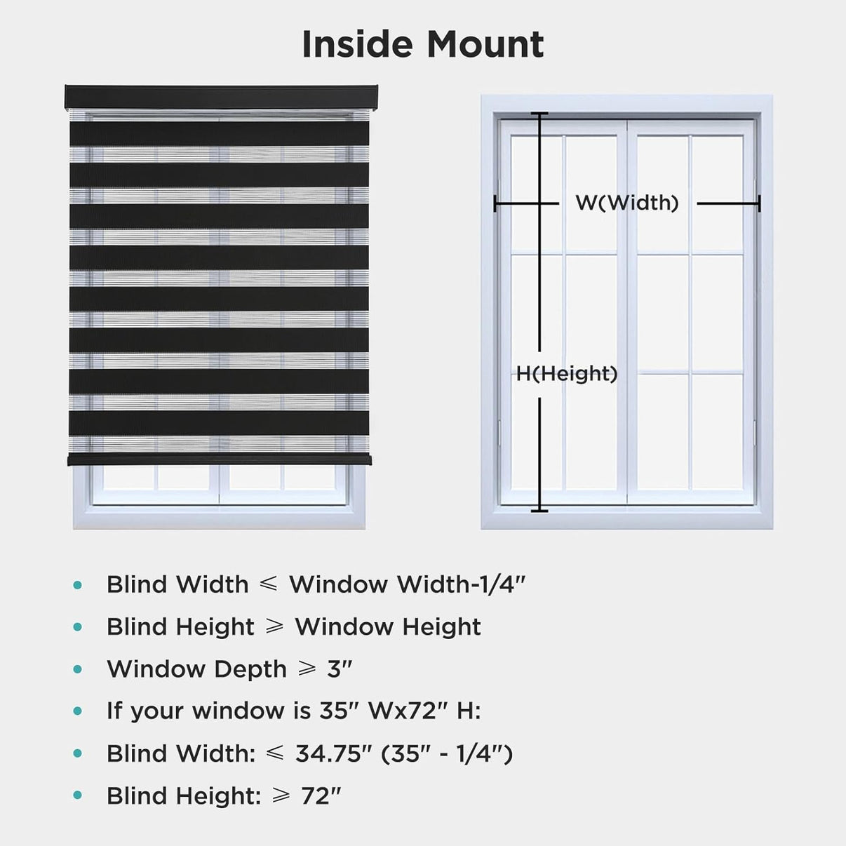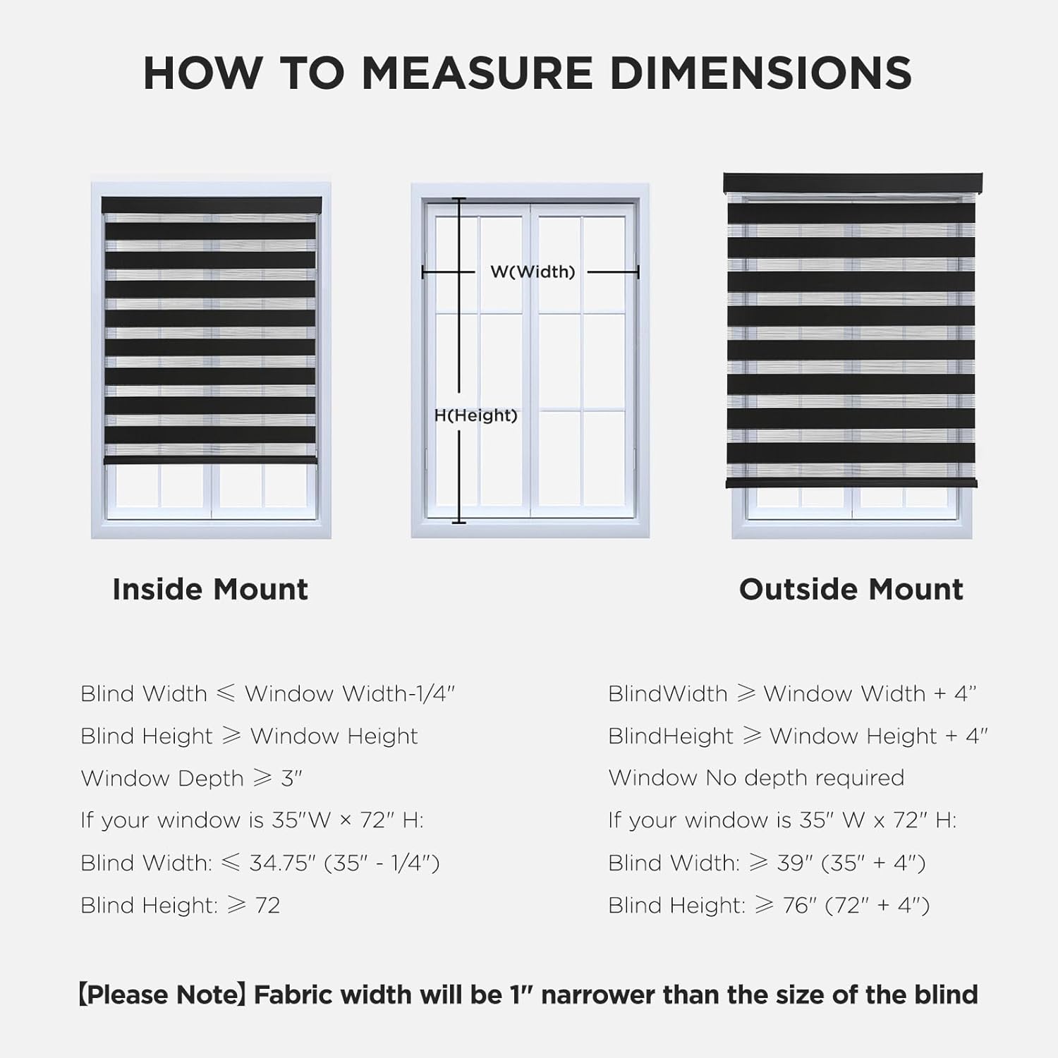 - 【How to choose a correct size】Example your window meas 35"W x 72"H:①INSIDE MOUNT: Window Width deduct 0.25" is Blind width. Blind Width≤35"-0.25=34.75"; Blind Height≥72". ②OUTSIDE MOUNT: Plus at least 4" is blind width, Blind Width≥35"+4"=39"; Blind Height≥72+4=76".【Plus Note】Fabric width will be 1" narrower than the size of the blind
