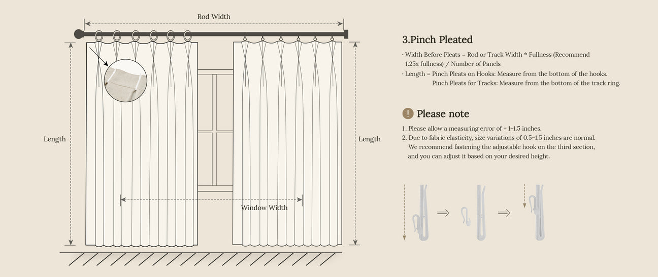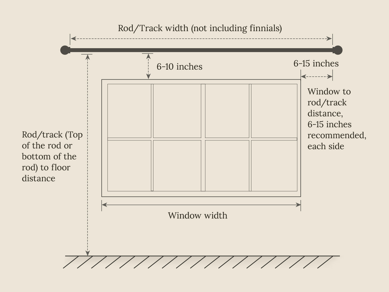 For accuracy, measure your curtain track or pole's width, not the window. For a new installation, extend it 6-15 inches beyond each side and 6-10 inches above the window. If using a pole, measure between the finials.