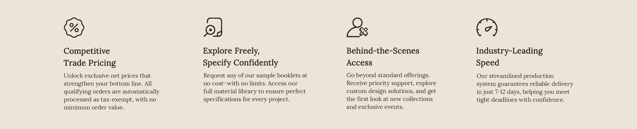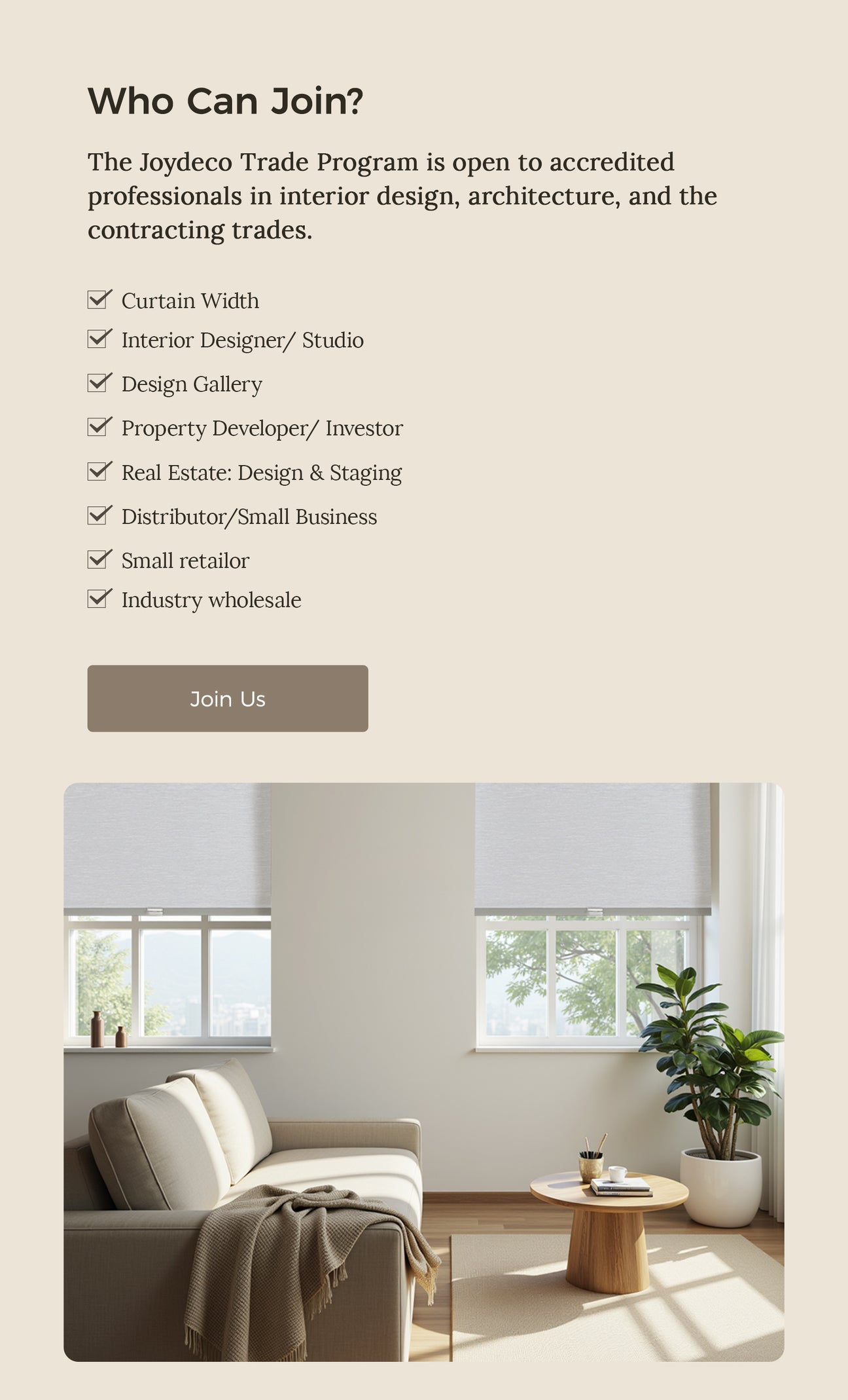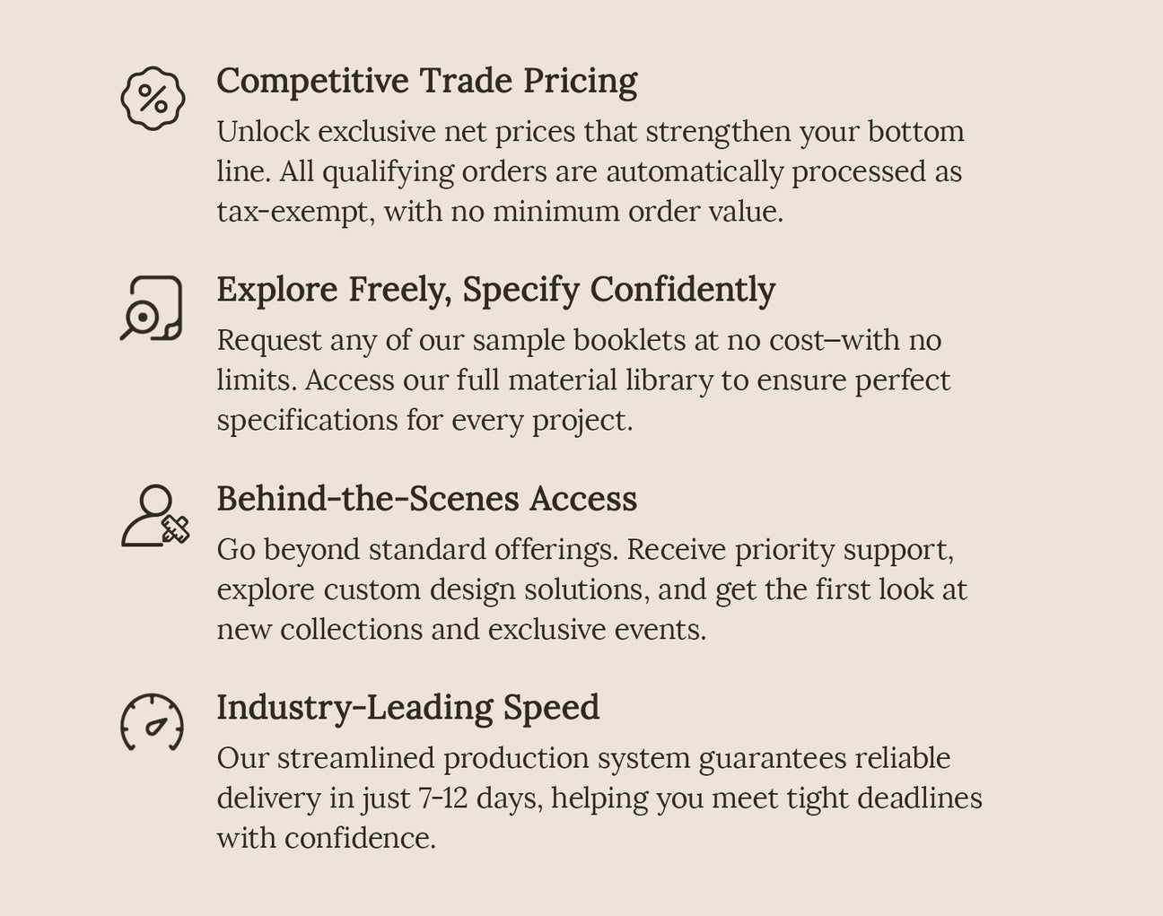 Empowering design professionals to infuse spaces with artistic joy. Enjoy exclusive trade pricing, dedicated support, and early access to our latest collections to bring your visionary projects to life.